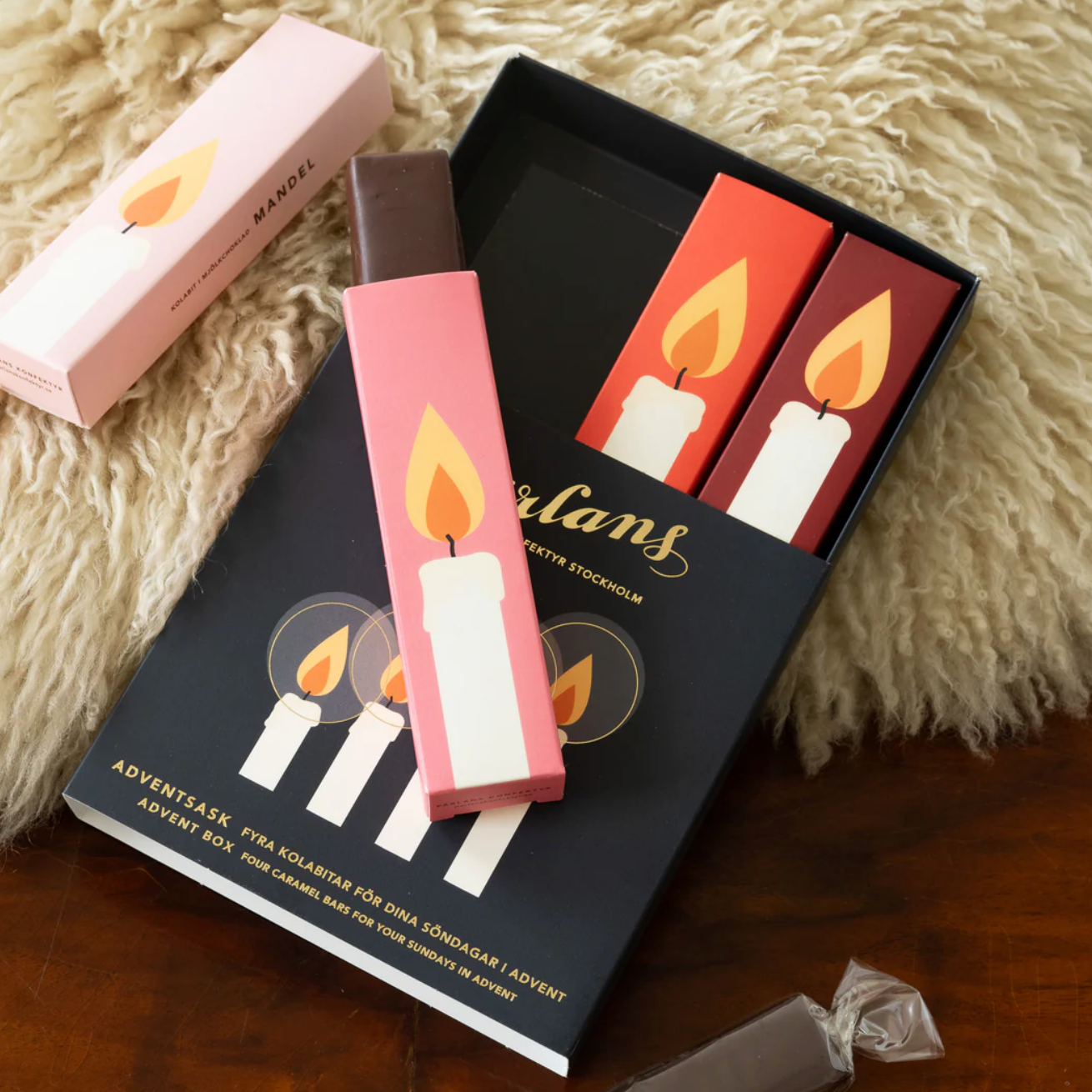 En adventskalender med fyra luckor - varje söndag bjuder på en kolabit stor nog att dela, eller behålla alldeles för sig själv, i säsongens godaste smaker av kola och ett fint lager mörk eller ljus ekologisk choklad. Fyra smakfulla ljus att lysa upp decembermörkret med.